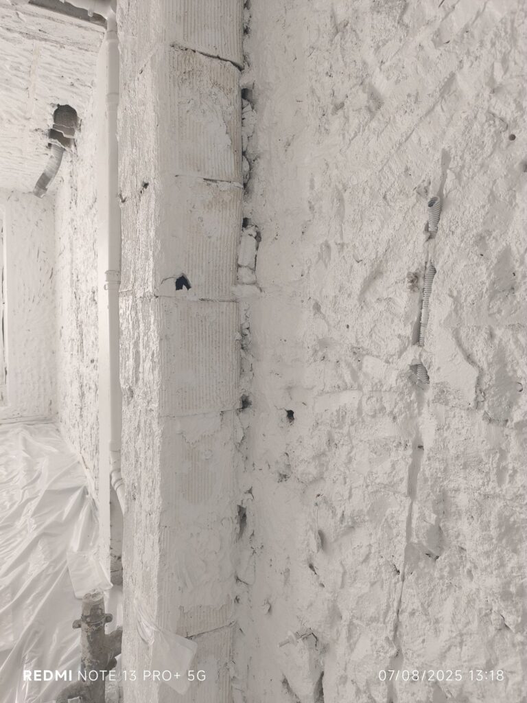 Dans les écoles, nous retrouvons beaucoup de polluants : plomb, amiante… Dans cette école, une colonne plombée au milieu d’une salle de classe. Décapage chimique nécessaire pour mettre en sécurité les enfants !